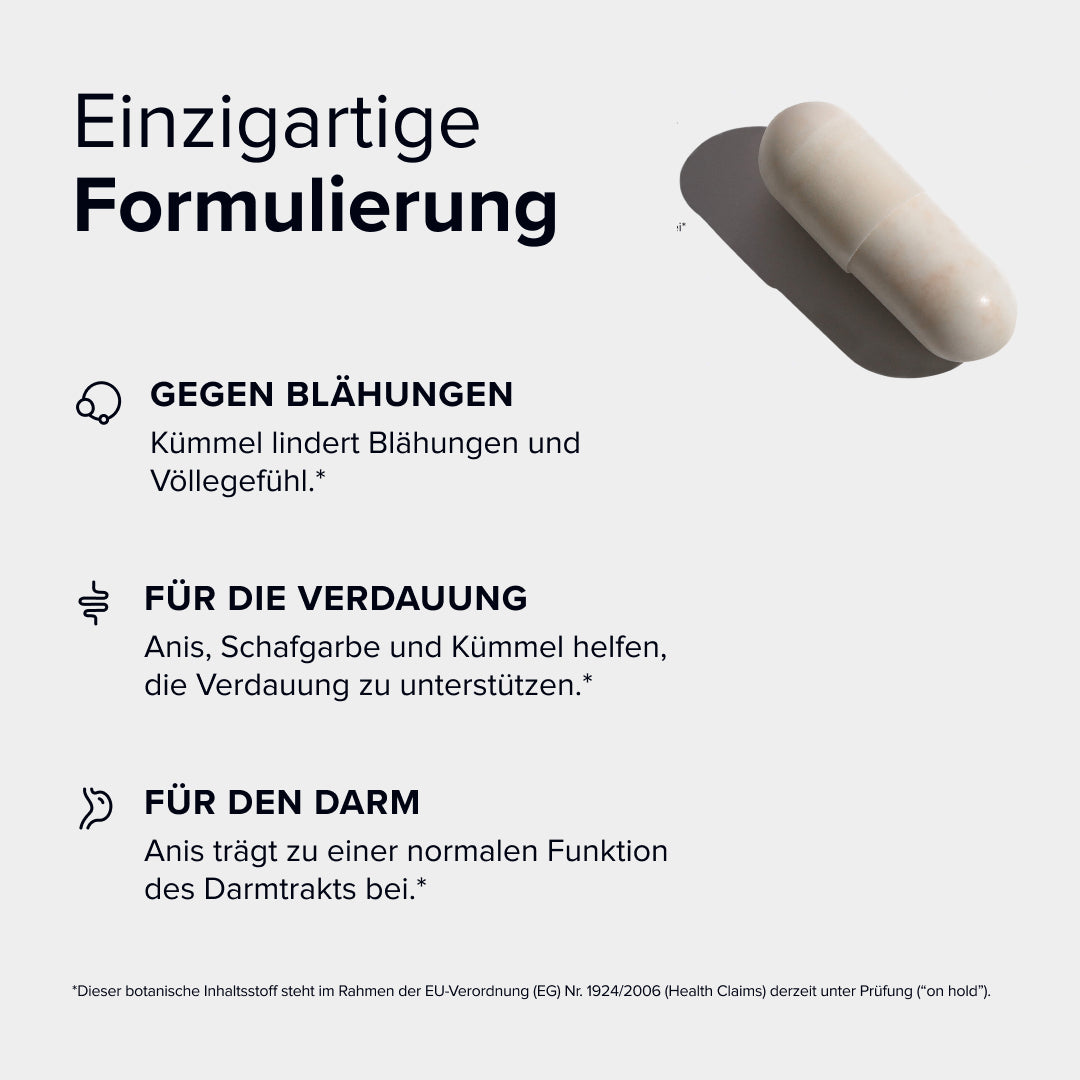 Anis hilft, die Funktion der Verdauungssäfte zu unterstützen³, während Schafgarbe die Verdauung erleichtert und zum Verdauungskomfort beiträgt²