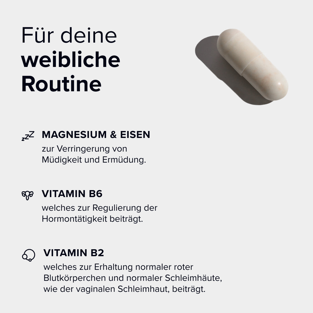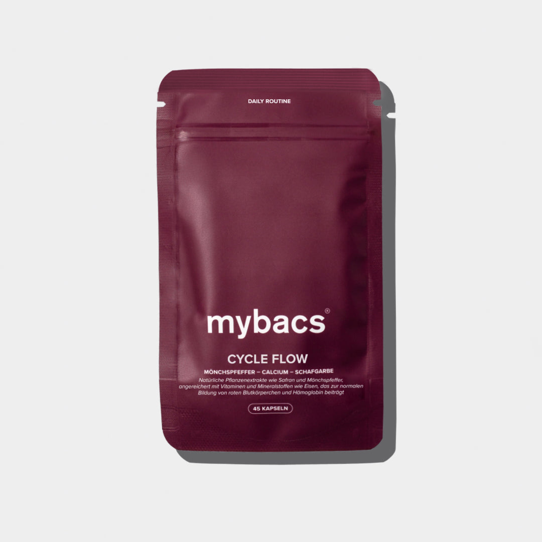 Cycle Flow enthält gezielt Eisen, welches die Bildung von roten Blutkörperchen und Hämoglobin unterstützt⁴. Zudem trägt Vitamin B2 zum Erhalt der roten Blutkörperchen und der Schleimhäute, wie der vaginalen Schleimhaut, bei⁷. Gerade während der Menstruation können diese Vitamine und Mineralstoffe ergänzend sinnvoll sein.