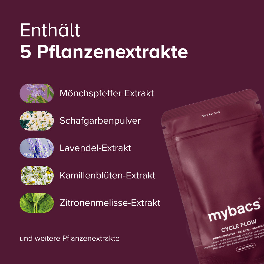 Cycle Flow ist speziell für die weiblichen Routine der Frau entwickelt: Eine abgestimmte Kombination aus ausgewählten Pflanzenextrakten, Vitaminen und Mineralstoffen für eine optimale Ergänzung während des gesamten Monats.¹,²,³