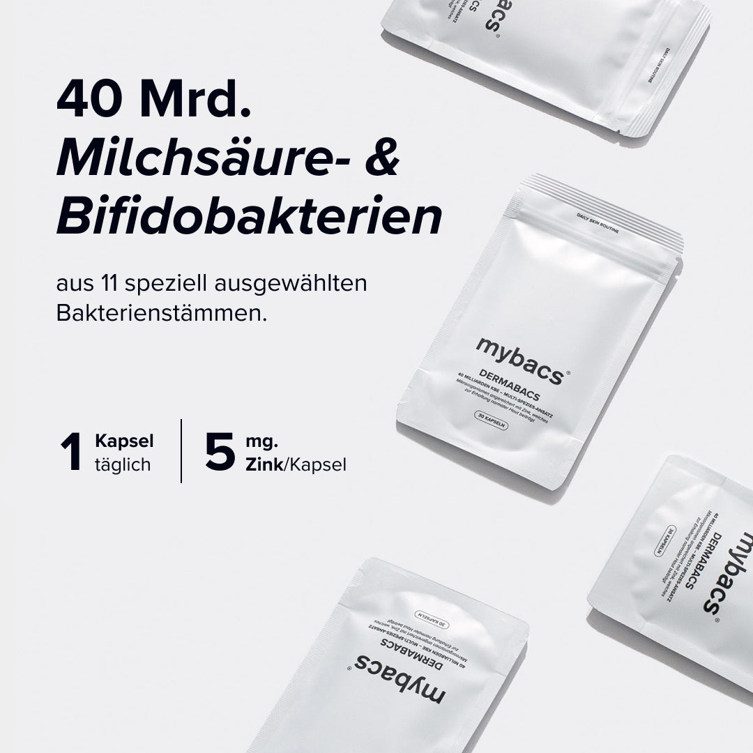 Die spezielle Kombination aus 11 ausgewählten Bakterienstämmen, Inulin als Nahrungsquelle für die enthaltenen Kulturen sowie Zink, das zur Erhaltung normaler Haut, Haare und Nägel beiträgt¹⁴, macht Dermabacs® zu einer durchdachten Ergänzung der täglichen Routine. Die tägliche Routine für deine Haut.