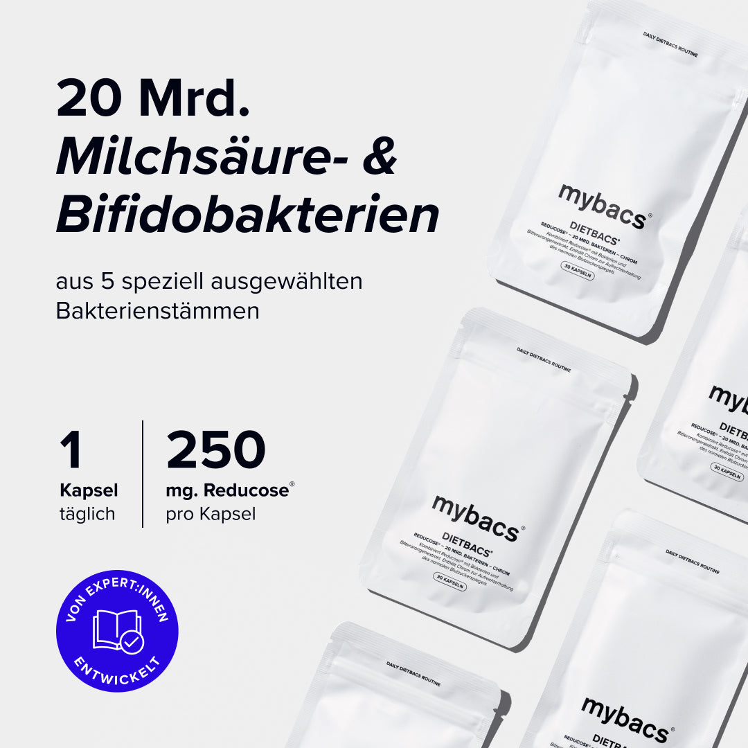 Dietbacs® ist ideal für Personen geeignet, die bewusst ihre Ernährung ergänzen möchten, um ihr Wohlfühlgewicht zu erreichen¹. Die Formulierung enthält 20 Mrd. Bakterien, den innovativen Markenrohstoff Reducose® (aus dem weißen Maulbeerblattextrakt) und Inulin.