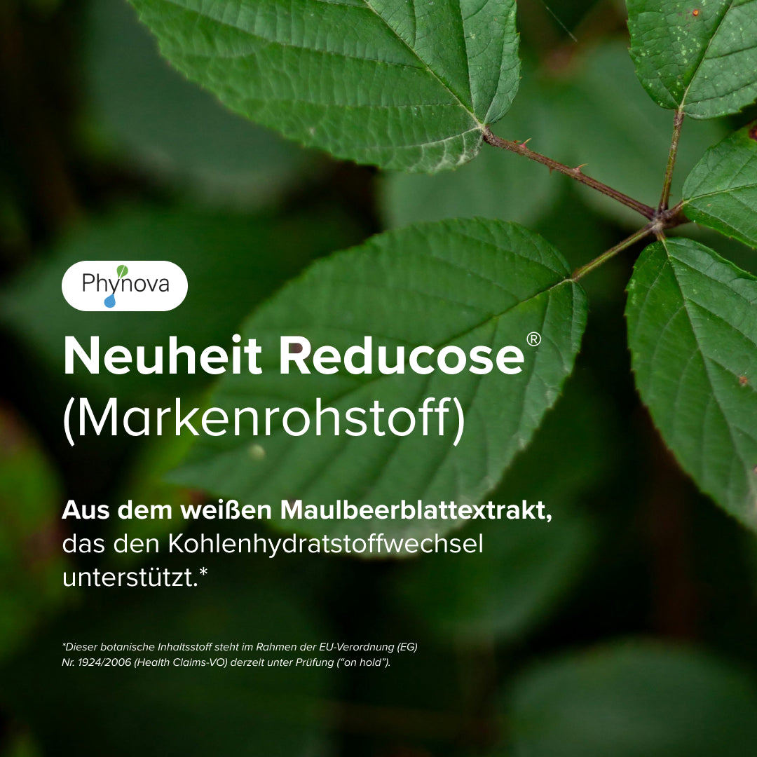 Dietbacs® enthält 250 mg Reducose® - ein patentierter Extrakt aus dem weißen Maulbeerblatt, welcher zur Aufrechterhaltung des Kohlenhydratstoffwechselgleichgewichts des Körpers beiträgt².