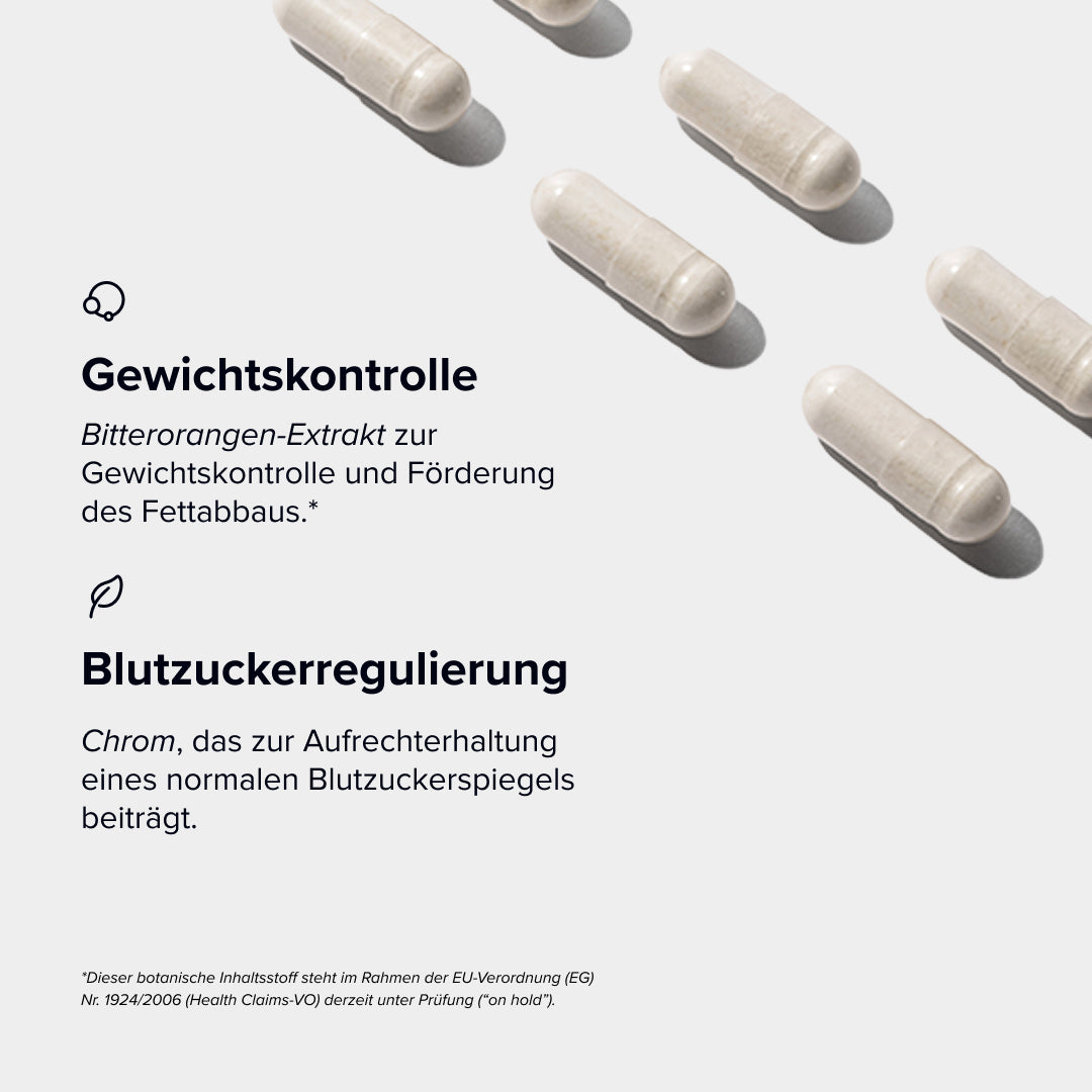 Ergänzt wird die Formulierung durch Bitterorangen-Extrakt, das zur Gewichtskontrolle und Förderung des Fettabbaus beiträgt¹. Und Chrom, das die Aufrechterhaltung des Blutzuckerspiegels unterstützt³.