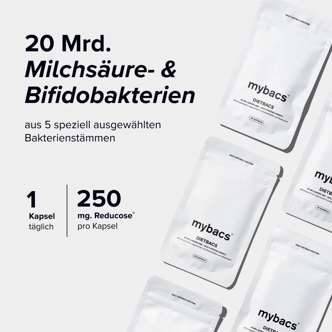 Dietbacs® ist ideal für Personen geeignet, die bewusst ihre Ernährung ergänzen möchten, um ihr Wohlfühlgewicht zu erreichen. Die Formulierung enthält 20 Mrd. Bakterien, den innovativen Markenrohstoff Reducose® (aus dem weißen Maulbeerblattextrakt) und Inulin.