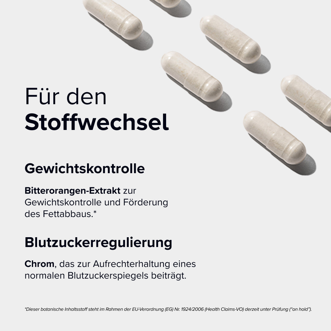 Ergänzt wird die Formulierung durch Bitterorangen-Extrakt, das zur Gewichtskontrolle und Förderung des Fettabbaus beiträgt¹. Und Chrom, das die Balance des Blutzuckerspiegels unterstützt.³