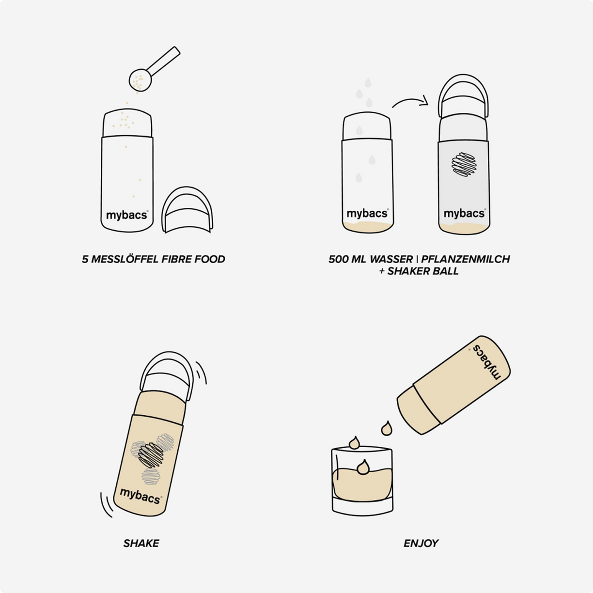 2. Ergänzung von Shakes: Verfeinere deine Lieblings-Shakes oder Smoothies mit Fibre Food und genieße den leckeren Vanillegeschmack. Du erhöhst damit nicht nur deine Ballaststoffzufuhr, sondern profitierst auch von einer cremigen Konsistenz und den wertvollen Nährstoffen.