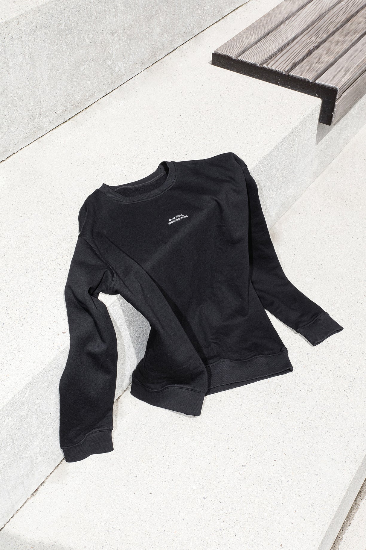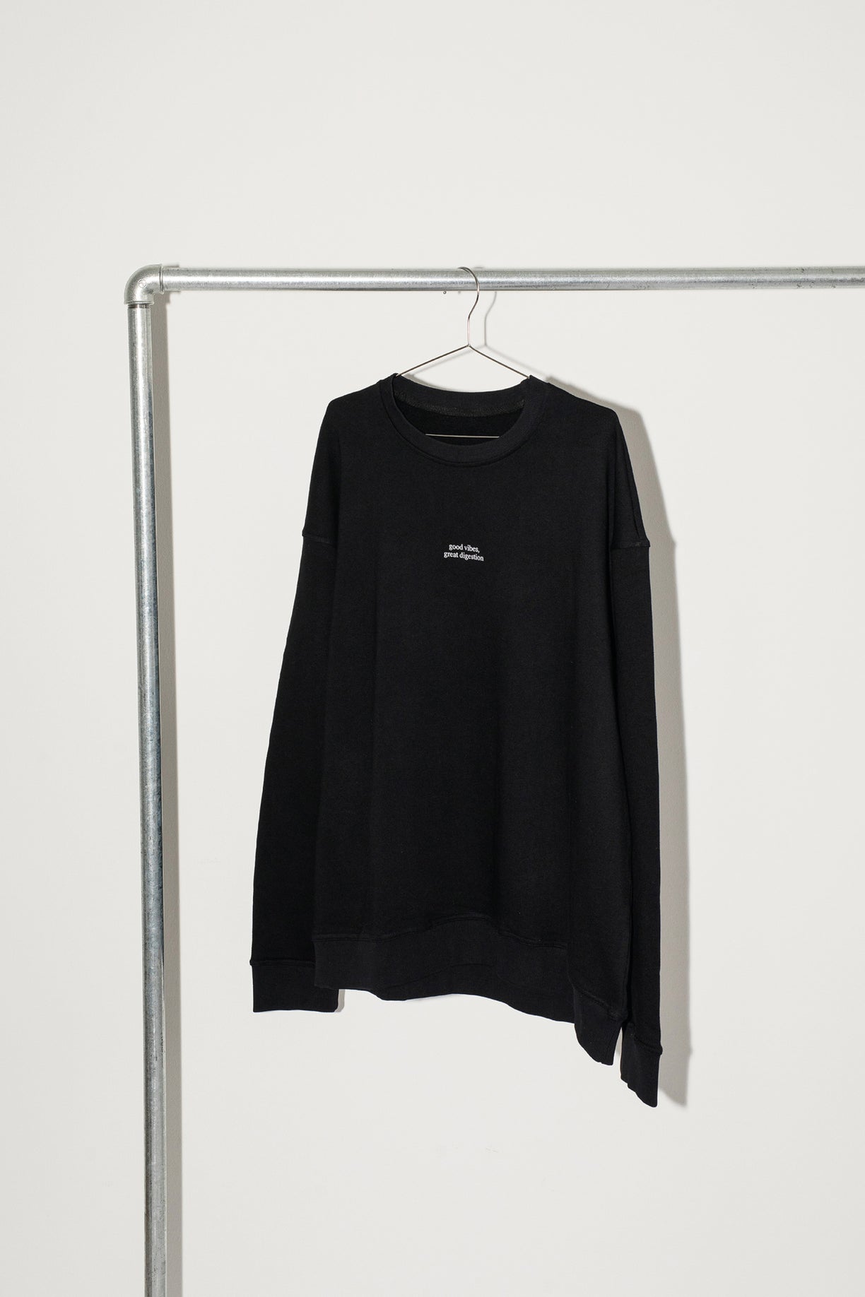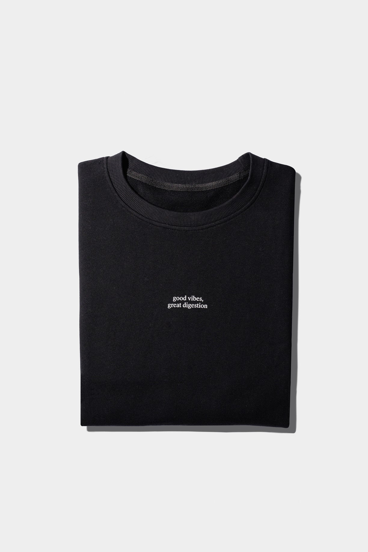 Oversize Pullover aus Baumwolle mit Rundhalsausschnitt und langen Ärmeln. Gerippte Abschlüsse. Lockerer Schnitt. Unisex. Dezenter Aufdruck auf der Vorderseite "good vibes, great digestion".