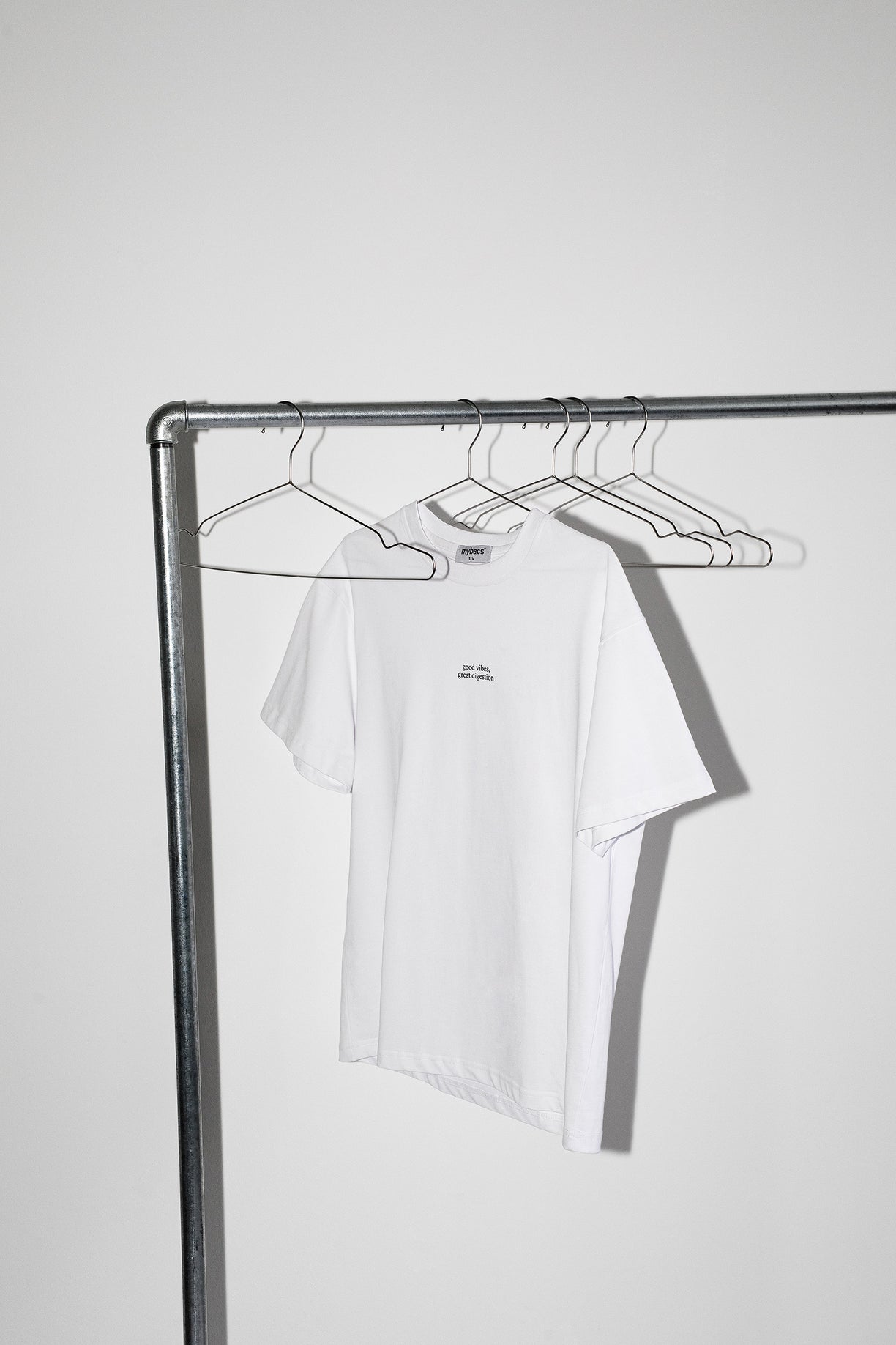 Oversize T-Shirt aus Baumwolle mit Rundhalsausschnitt und kurzen Ärmeln. Lockerer Schnitt. Unisex. Dezenter Aufdruck auf der Vorderseite "good vibes, great digestion".