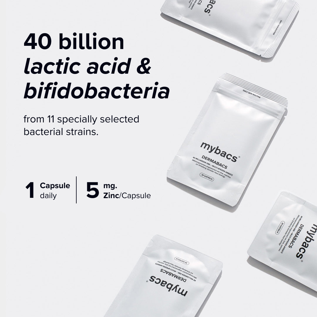 The special combination of 11 selected bacterial strains, inulin as a food source for the included cultures, and zinc, which contributes to the maintenance of normal skin, hair, and nails¹⁴, makes Dermabacs® a thoughtful addition to your daily routine. The daily routine for your skin.
