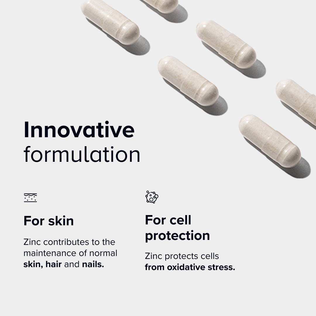 The zinc contained in Dermabacs® actively contributes to the maintenance of normal skin, hair and nails¹ and protects cells from oxidative stress¹.