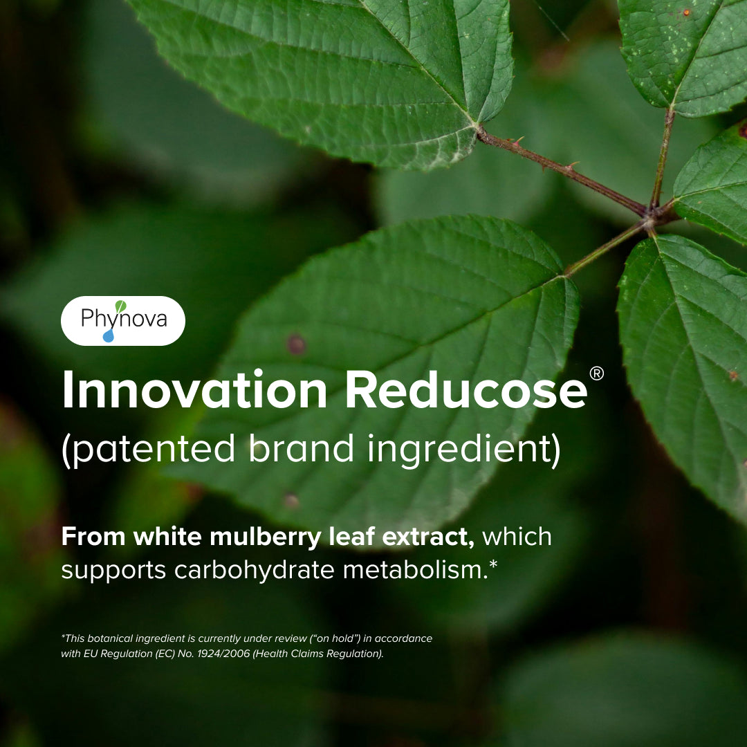 Dietbacs® enthält 250 mg Reducose® - ein patentierter Extrakt aus dem weißen Maulbeerblatt, welcher zur Aufrechterhaltung des Kohlenhydratstoffwechselgleichgewichts des Körpers beiträgt².