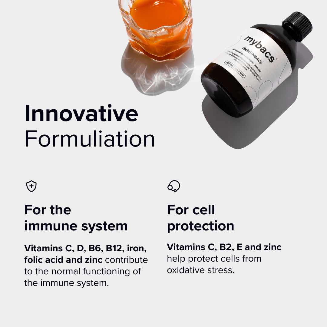 Immunbacs contains vitamin C, vitamin D, vitamin A, vitamin B6, vitamin B12, folic acid, zinc and iron. These vitamins and minerals all contribute to the normal function of the immune system.
