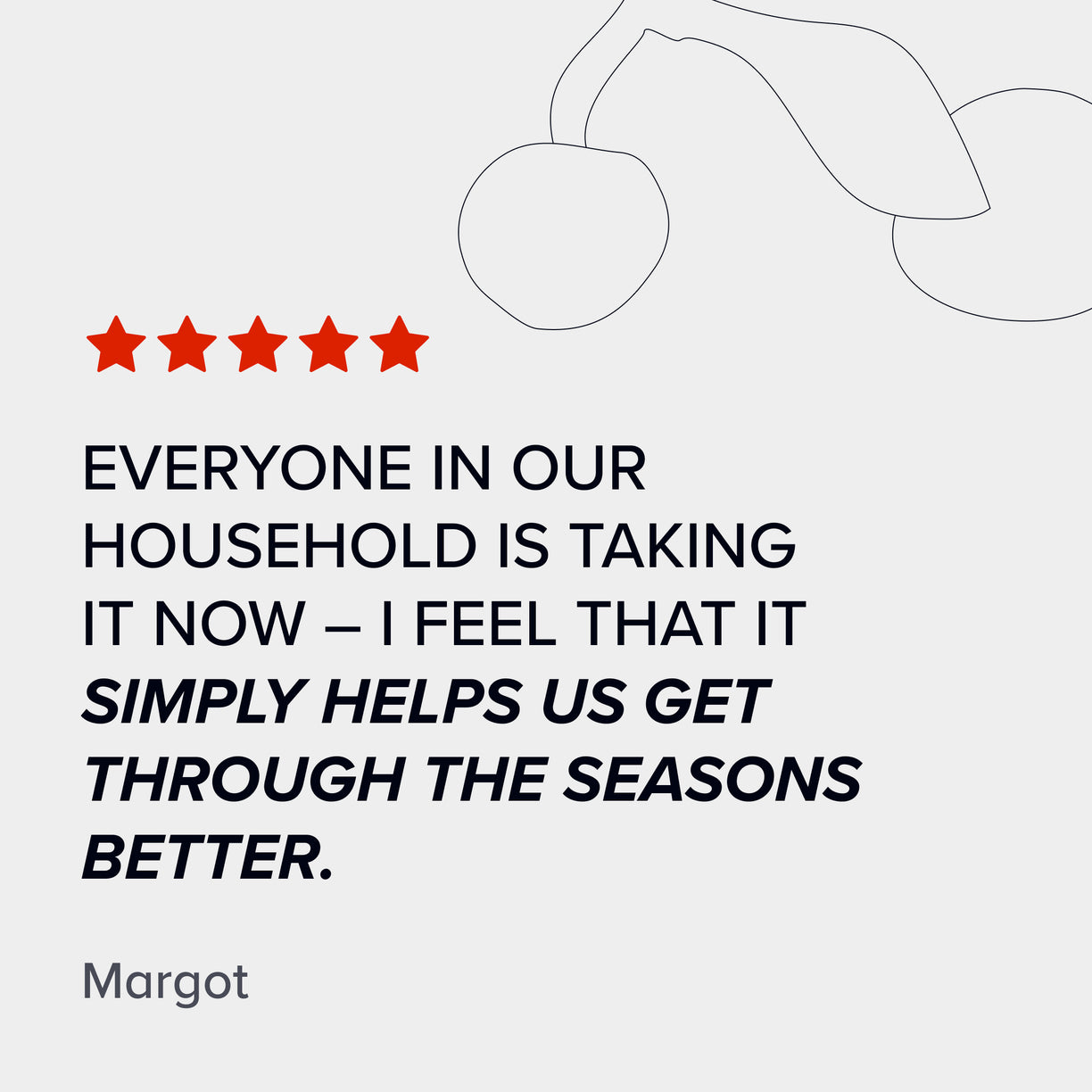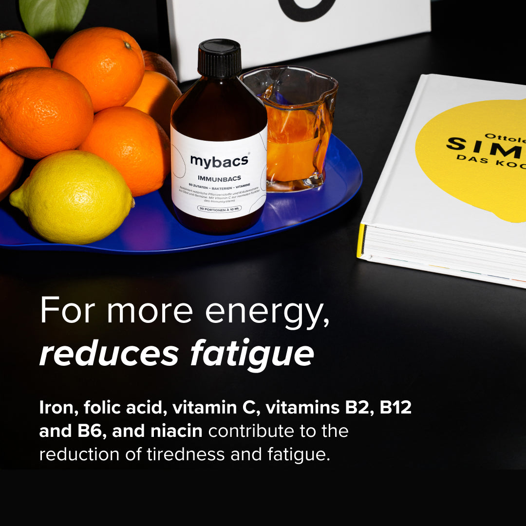 Thanks to its simple and tasty form, it is ideal for the whole family. It is particularly useful when an additional supplement to the diet is desired and can be a useful addition during stressful or strenuous periods⁴. The vitamins C, B6 and B12 contained in Nutribacs® support the immune system and reduce fatigue⁴.