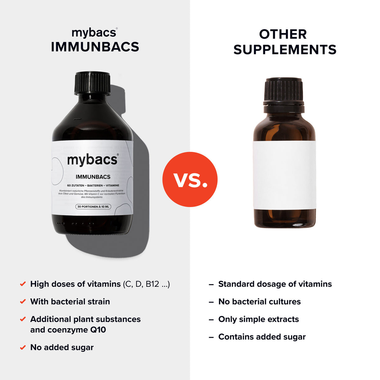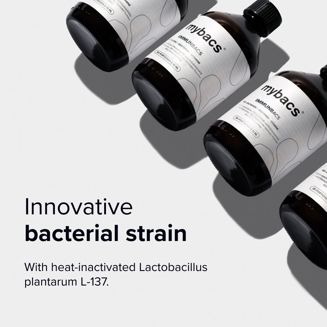 Immunbacs combines 60 carefully selected ingredients, including plant substances, herbal extracts, vitamins, minerals and an inactive bacterial strain.