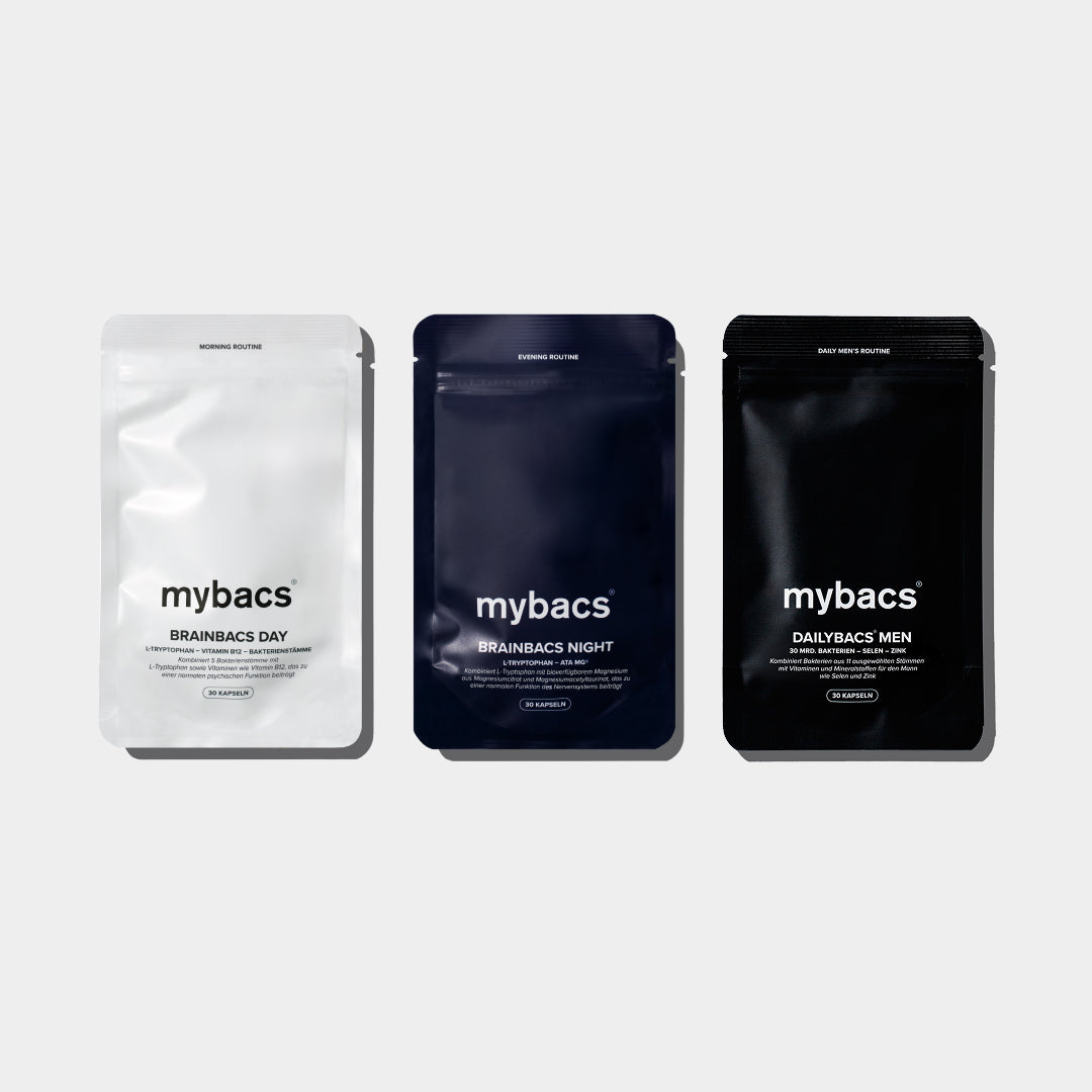 DAILYBACS® MEN stärken das Immunsystem mit Vitamin C und Selen¹, während BRAINBACS mentale Balance und Konzentration fördern²˒³ – zusammen die ideale Routine für Körper und Geist.