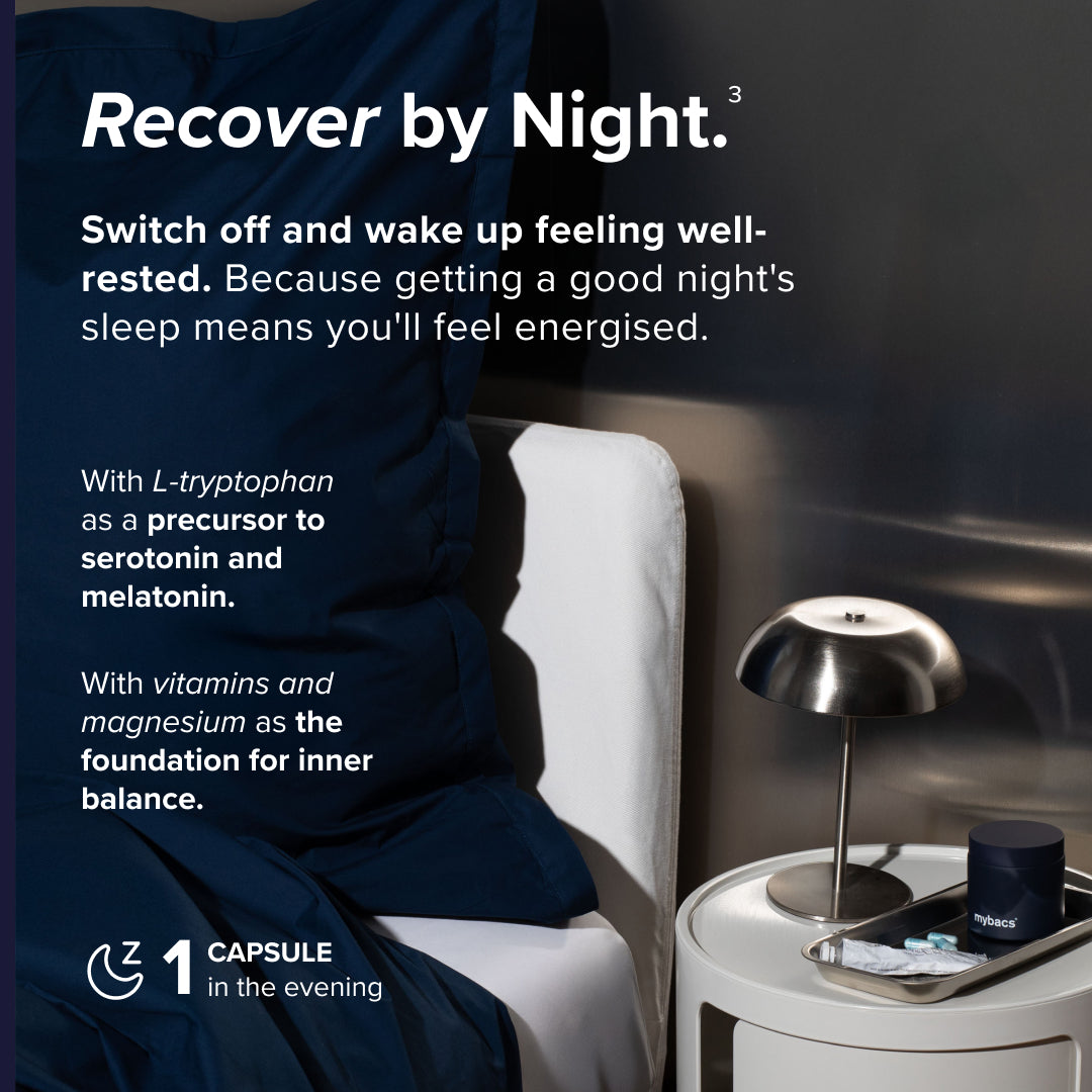 L-TRYPTOPHAN: La capsula notturna contiene anche L-triptofano. Qui funge da precursore della serotonina e della melatonina, nota come ormone del sonno, e si dice che favorisca la calma mentale prima di andare a letto.