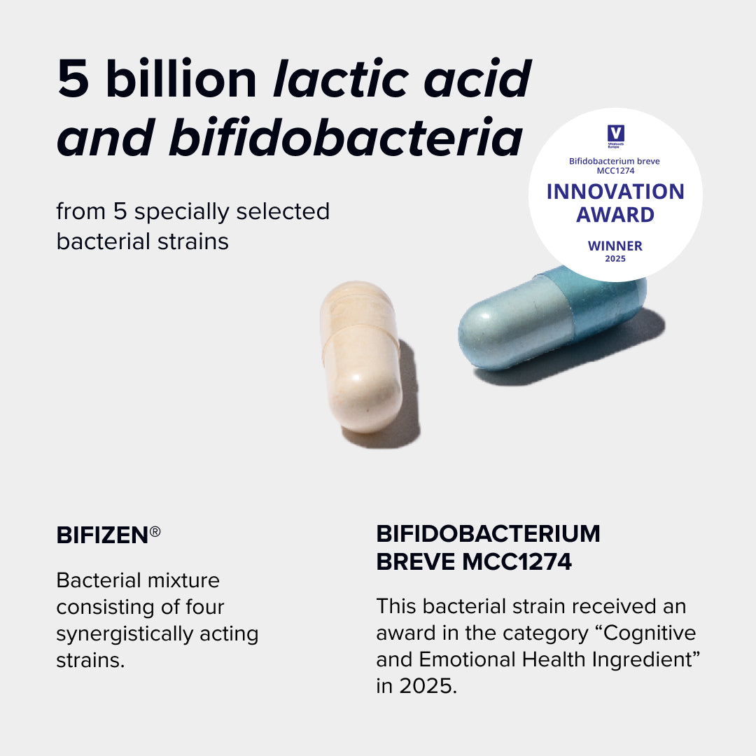 CEPPI BATTERICI: La miscela di cinque diversi ceppi batterici (Bifizen® e Bifidobacterium breve MCC1274) agisce sul cosiddetto asse intestino-cervello. Poiché gran parte della serotonina viene prodotta nell'intestino, il supporto del microbioma intestinale dovrebbe favorire anche il benessere del cervello.