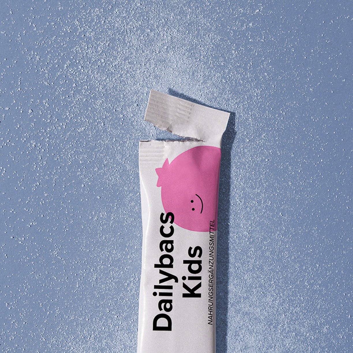 Dailybacs® Kids - a misura di bambino e pratico. Gli ingredienti dei nostri stick diretti al delizioso gusto di frutti di bosco sono stati sviluppati appositamente per essere assunti dai bambini. Ideali a casa e in viaggio.