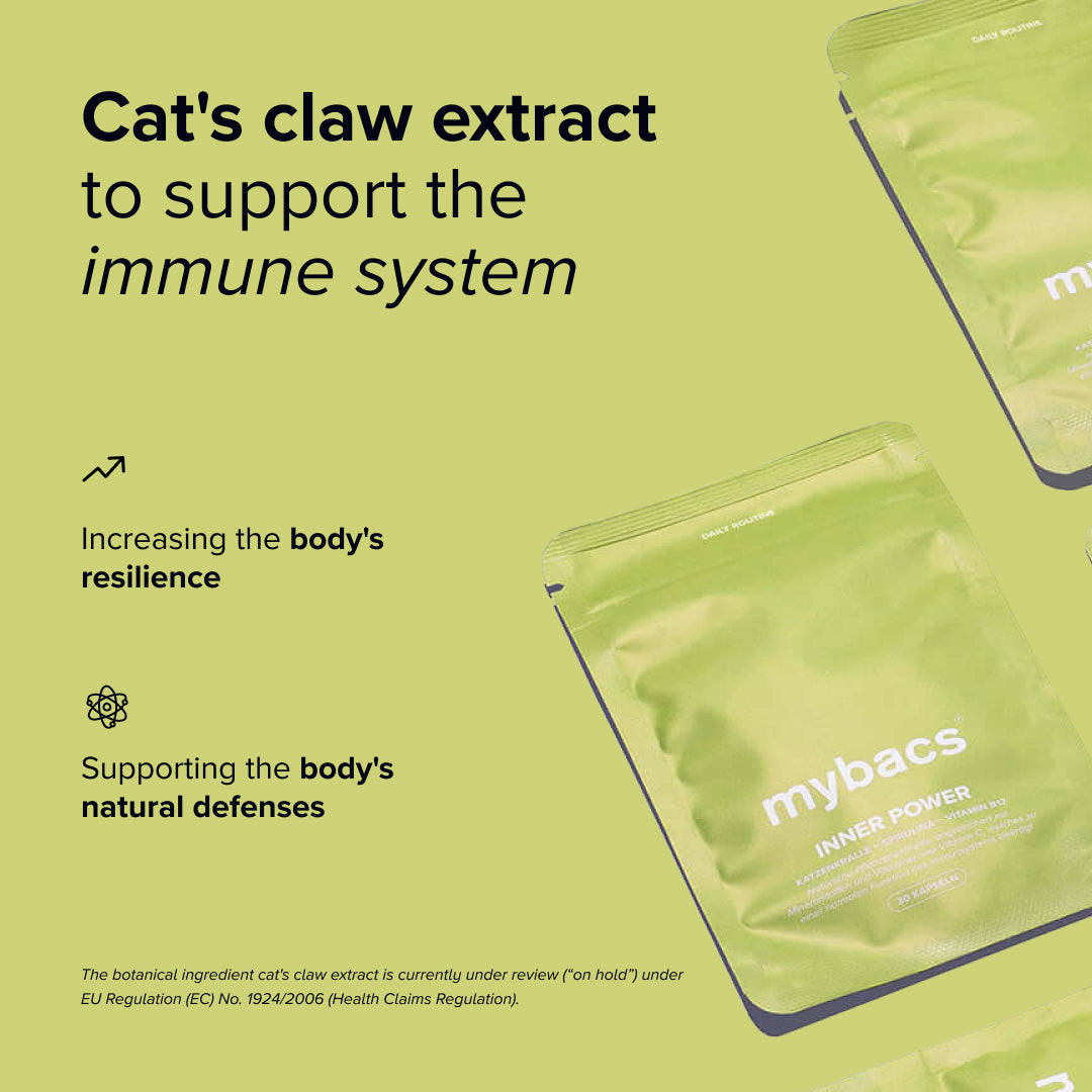 Potere interiore è ideale per chiunque voglia rafforzare efficacemente il proprio sistema immunitario. Soprattutto, Inner Power+ può essere utilizzato a scopo preventivo e di intervento per migliorare le difese naturali e aumentare la vitalità generale. Inner Power+ contiene una miscela di superalimenti vitaminici naturali come l'artiglio di gatto e l'estratto di semi d'uva.