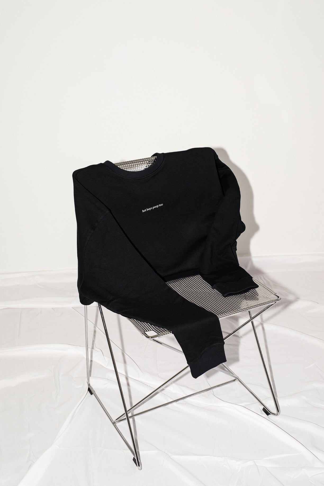 Maglia oversize in cotone con scollo rotondo e maniche lunghe. Finiture a coste. Taglio ampio. Unisex. Stampa discreta sul davanti "anche i ragazzi sexy fanno la cacca"..