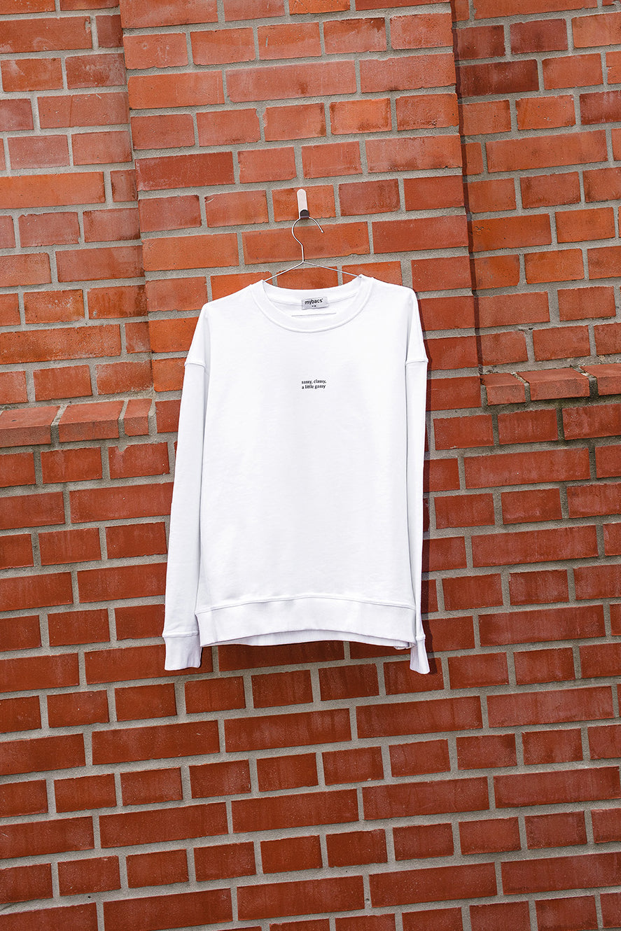 Maglia oversize in cotone con scollo rotondo e maniche lunghe. Finiture a coste. Taglio ampio. Unisex. Stampa discreta sul davanti "sassy, classy, a little gassy".